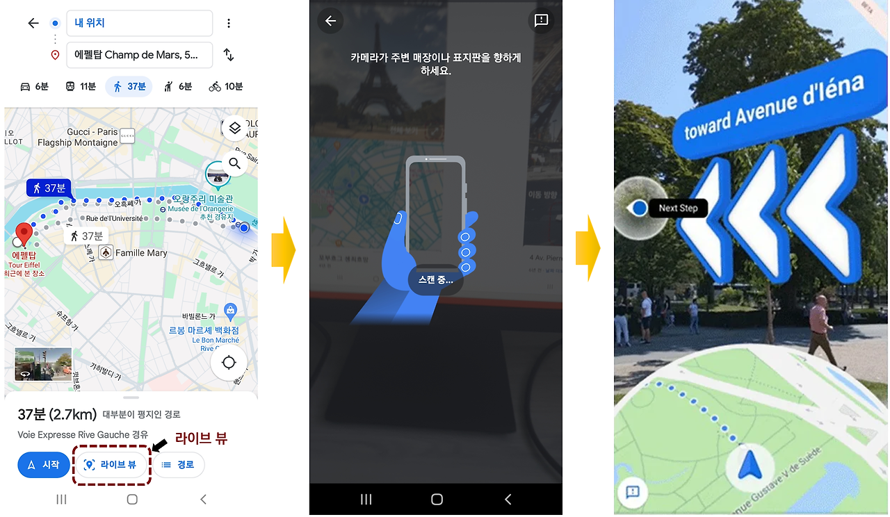 구글지도 모바일 버전에서 라이뷰 뷰 화면