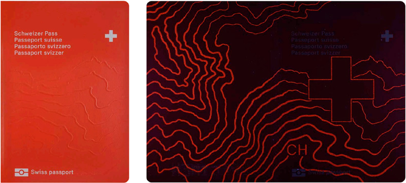 스위스 여권 표지 : uv 광선에서 보이지 않는 표시들이 나타남